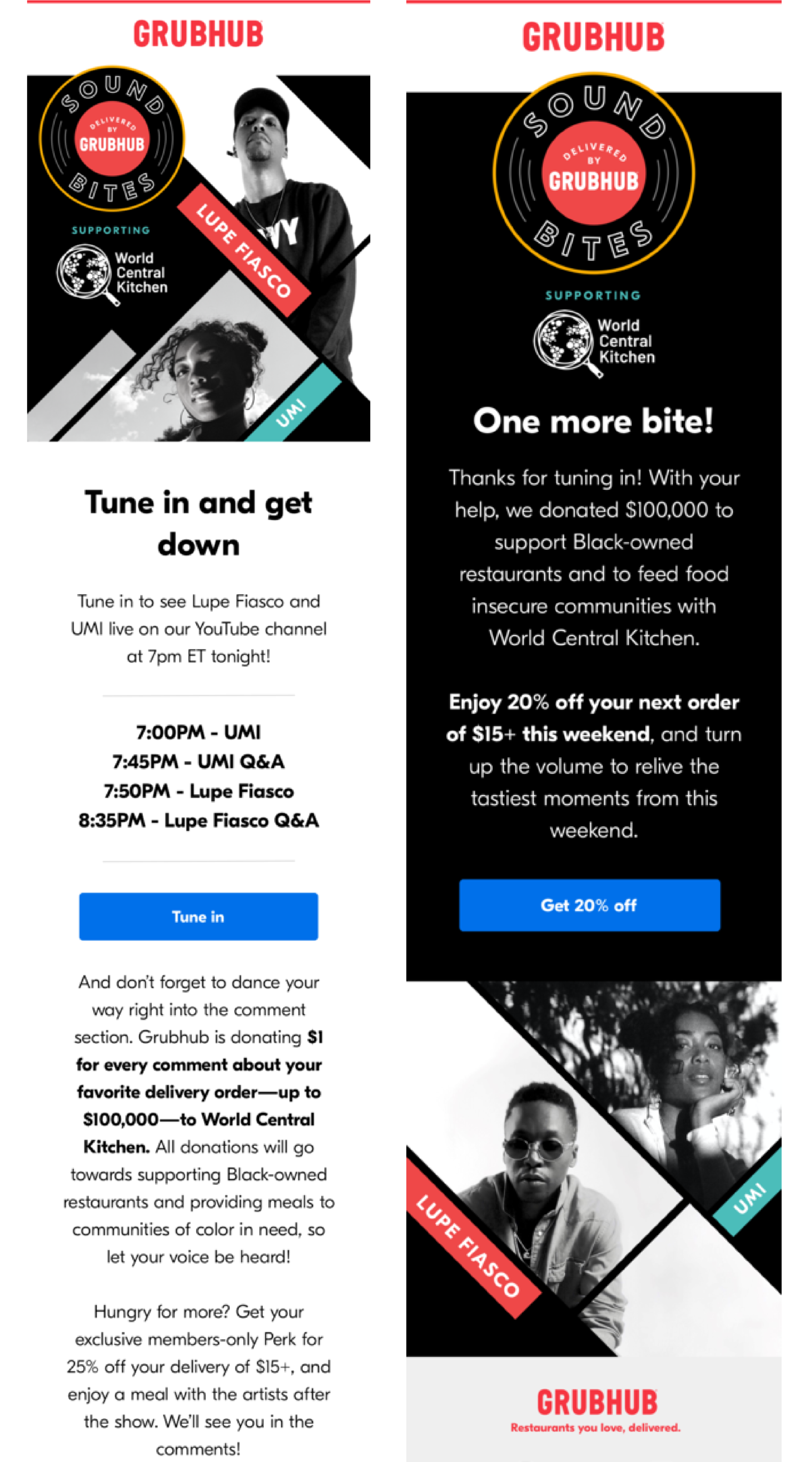 Grubhub Sound Bites was an ongoing virtual concert series that invited people to bring their takeout to the show.
